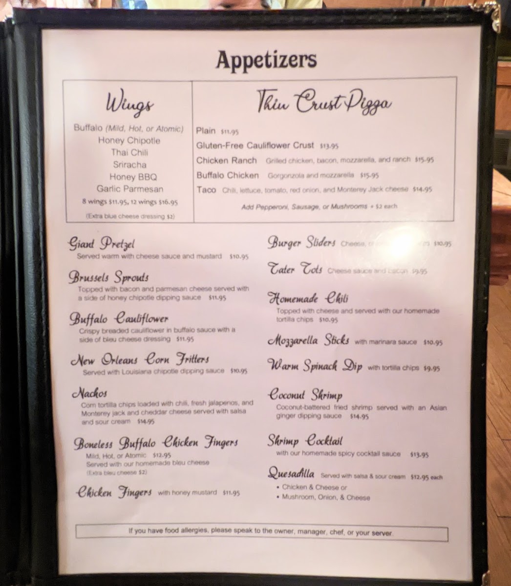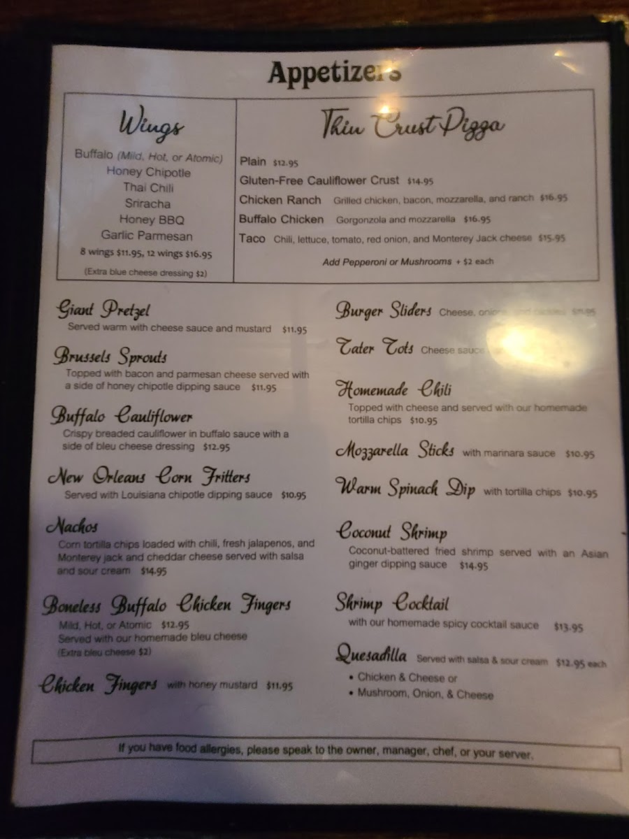 Buffalo Mild, Hot, ATOMIC; Honey Chipotle; Thai Chili; Sriracha; Garlic Parmesan; BBQ; served with bleu cheese dressing (Can be made gluten free in our isolated fryer!)